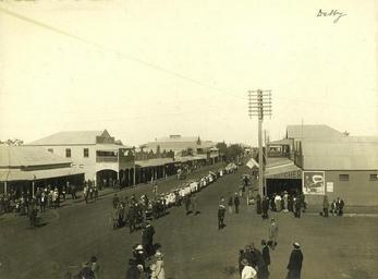 | Keywords: Dalby main street ca. 1915.jpg Children marching in the main street of Dalby ca 1915<br/> Possibly at the time of a visiting recruiting team for recruitment for troops to go overseas during WWI handle 10462/deriv/122968 ca 1915 Author 27 11 0 92 S 151 15 47 86 E region AU_heading S PD-Australia StateLibQld-License History of Dalby Queensland |