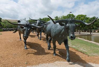 Keywords: dallas texas bronze steers cattle statues outside art artwork urban