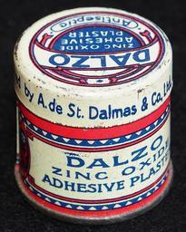 | Keywords: Dalzo zinc oxide adhesive plaster tin, laboratoires BE Phillips Nossegem, foto2.JPG Very old product that is not produced and not sold any more Note that some tins may look the same but when looked for carefully there are some slight differences Photographed at a collector of Droste memorabilia and old tin cans For more info see http //www tincollectors nl/ tincollectors nl or email info tincollectors nl own 2014-02-08 12 26 45 Alf van Beem CC-zero Trademarked First aid tins | ||||