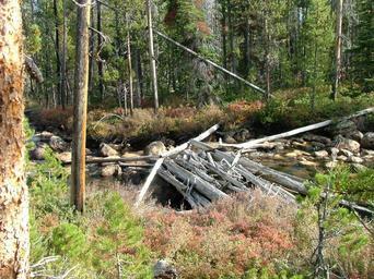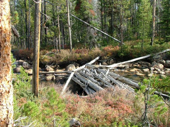 Keywords: dam blocking stream rapids forest river rocks trees flowing