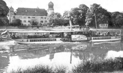 Keywords: Dampfschiff Graf Moltke.PNG Raddampfer Graf Moltke vor dem Schloss Hehlen postcard between 1906 1912 postcard was stamped in 1912 author possible PD-old-1923 Wasserschloss Hehlen Ships built in 1888 Paddle steamers of Germany