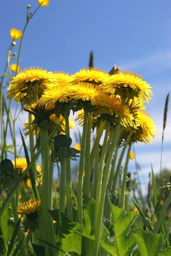 Keywords: dandelion flower plant meadow yellow green sky blue spring