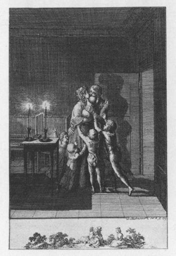 | Keywords: Daniel Chodowiecki Gattin.jpg Drei Blätter zu Neuffer's Dichtung 2 Die Gattin Der Mann kommt unverhofft von der Reise zur Familie zurück; er tritt rechts zur Thüre herein und umarmt die Frau welche das jüngste Kind auf dem Arme hat; vier Kinder drängen sich an ihn heran Beschreibung lt Quelle <br>Blatt 1 Blatt 2 Blatt 3 der Serie Chodowiecki Auswahl aus des Künstlers schönsten Kupferstichen 135 Stiche auf 30 Carton-Blättern Nach den zum Theil sehr seltenen Originalen in Lichtdruck ausgeführt von A Frisch Berlin Neue Folge Verlag von Mitscher Roestell Berlin 1885 self scanned from book Creator Daniel Chodowiecki PD-old-100 Daniel Chodowiecki Families in art |