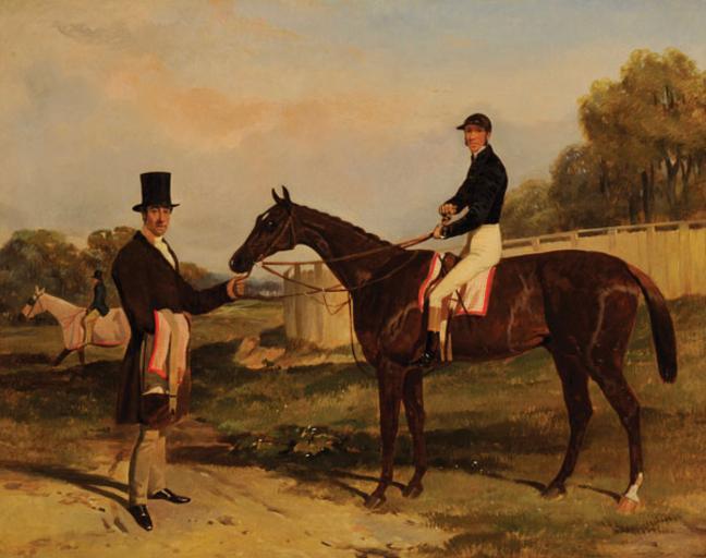 | Keywords: Daniel O' Rourke by Harry Hall.jpg en Daniel O'Rourke Thoroughbred racehorse with his owner John Bowes and jockey Frank Butler in a painting by Harry Hall Daniel O'Rourke won the 1852 Epsom Derby http //www artfund org/assets/image/artwork/enlarged/Bowes_Hall_Daniel jpg Artfund org Harry Hall 1814-1882 ~ 1852 PD-art PD-100 Epsom Derby Paintings of horses Images from Artfund org | ||||