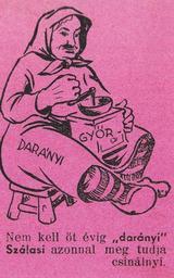 | Keywords: Darányi caricature.jpg en A pamphlet of the far-right Arrow Cross Party from 1938 published after the announcement of the Programme of GyÅ‘r by Prime Minister Kálmán Darányi which initiated a 5-year term military improvement and investment Play on Darányi and darálni mince words The message of the cartoon is that Ferenc Szálasi leader of the Arrow Cross Party does not need five years to military reforms hu Nyilas röpcédula 1938-ból amely a Darányi által meghirdetett gyÅ‘ri program idÅ‘tartamának hosszúságát kritizálja Izsák “Pölöskei “Romsics “Urbán Magyar miniszterelnökök 1848 “2002 Kossuth Kiadó Budapest 2003 p 110 photo and p 227 register author 1938 PD-old Kálmán Darányi Caricatures of men of Hungary Arrow Cross Party |