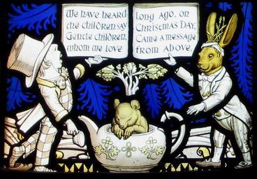 Keywords: Daresbury window 3.jpg Photograph taken by me 7 April 2007 2007-04-07 own assumed Peter I Vardy Mad Tea Party Animals with human clothing The Mad Hatter All Saints' Church Daresbury stained glass Geoffrey Webb March Hare