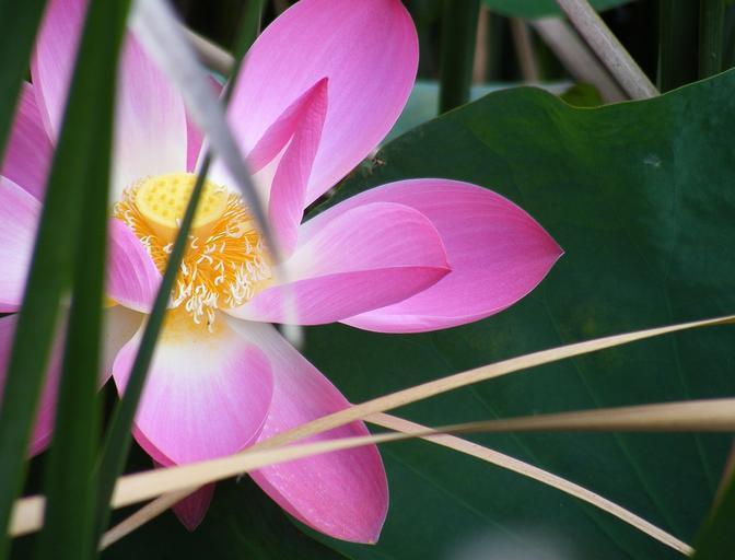 Keywords: dark green lake leaf lotus papyrus pink pollen water lilly yellow nature flora flower plant