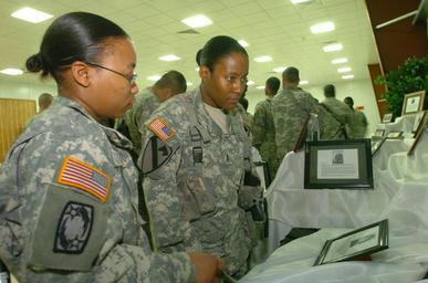 | Keywords: "Dark Horse" CSM gives a history lesson to Black Jack troops DVIDS36973.jpg en Capt Latonya Jones of Chicago left and Chief Warrant Officer 2 Betty Fisher of Okmulgee Okla look through a display of famous African-American icons at Forward Operating Base Prosperity in Baghdad Feb 16 2007-02-16 Sgt 1st Class Kap Kim https //www dvidshub net/image/36973 36973 2007-02-26 11 25 FORWARD OPERATING BASE PROSPERITY IQ PD-USGov Forward Operating Base Prosperity Images from DoD uploaded by Fæ | ||||
