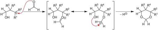 Keywords: Darstellung der 1,3-Dioxane 1-Seite001.svg building of 1 3-Dioxane Darstellung der 1 3 Dioxane Own 2012-10-27 Flauski <span class signature-talk >talk</span> PD-chem Cc-zero Prins reaction Protecting groups Dioxanes