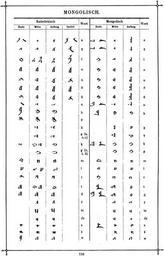 Keywords: Das Buch der Schrift (Faulmann) 131.jpg 130 132 Seite 131 illustriert die traditionelle de Mongolische Schrift and die davon abgeleitete kalmykische de Klare Schrift Todo bichig Todo bichig Mongolian script Alphabet charts