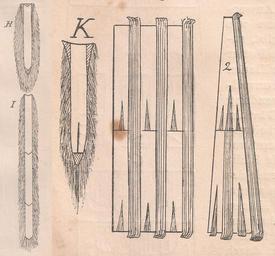 Keywords: Das Kürschner-Handwerk, II. Auflage 3. Teil, S. 26. Schweife.jpg Zobelschweifen Früher wurden mehr als heutzutage grössere Gegenstände aus Zobelschweifen hergestellt Besonders in der Zeit zwischen 1830 bis 1890 und hauptsächlich in und für England wurden Muffen Boas Etole Besätze Pelerinen ja ganze Mäntel aus Schweifen gefertigt Das Princip dieser Arbeiten ist einfach benötigt aber ein sehr sorgfältiges gutes Sortiment Die Schweife werden gestreckt das Wilde der Wurzel und die Spitze soweit das Haar zu lang ist abgeschlagen Dann werden die Schweife sortiert und auf eine gleichmässige Länge gebracht Dann wird jeder Schweif durch galonieren auf die notwendige Breite gestellt Je nach Bedarf und der Rauche angemessen werden die Spitzen mehr oder weniger sei es mit schwarzem Sämischleder sei es mit gutem Seidenband galoniert Fig K zeigt den Schweif vorbereitet Daneben den Anfang eines Muffblattes oder einer Garnitur die oben so breit wie unten ist Zwischen jeden Schnitt ist eine Seidengalone genäht Gewöhnlich setzt man die einzelnen Schweife erst zu Stössen zu einander bis die notwendige Höhe erreicht ist K 2 zeigt ein Beispiel wenn der zu machende Gegenstand oben schmäler wie unten ist Im Allgemeinen wird durch ein entsprechendes galonieren die Form mehr oder weniger verändert Angewendet werden fast ausschliesslich Seidengalonen Die Herstellung von grösseren Boas kann auf zweierlei Art geschehen Die Schweife können ganz bleiben 4-8 je nach der notwendigen Staerke des Boas nebeneinander gesetzt und nur schwach galoniert Dann die einzelnen Stösse aufeinander bis die Länge erreicht ist; als Abschluss die Spitzen der Schweife Da diese Arbeitsweise aber keine schöne runde Form ergiebt wenn sie auch die praktischste ist so hat man eine compliciertere Verarbeitung gefunden um auch in dieser Hinsicht einen besseren Effekt zu erzielen Das zu verwendende Material muss aber möglichst in Farbe und Rauche passen Die Schweife werden gut in die Breite gestreckt und dann quer in ½ ctm breite Streifen geschnitten Sind alle Schweife auf diese Weise vorbereitet werden die einzelnen Schnitte in einander versetzt Man beginnt mit den Spitzen indem die rauchsten an des Ende zu stehen kommen Das Zusammennähen der Querstreifen soll mit guter starker Seide geschehen und der Faden ohne Ende sich durch das ganze Band hindurchziehen da er die Haltbarkeit der Boas erhöht Ist der Streifen fertig wird er probeweise auf einen Stab gedreht um etwaige Fehler in Farbe und Rauche ausbessern zu können Die Stärke des Stabes muss der Rauche des Bandes angepasst sein oben stark und nach unten zu schwächer werden Auf diesen Stab wird ein Streifen aus Atlass mit Zwirn befestigt Siehe Abbildung und Beschreibung Hilfsmittel Dann wird über diesen Stock aufgelöster Kautschuk gestrichen und der Boa darauf gedreht Nach dem Trockenen wird der Stab herausgezogen und durch eine Füllung aus Wolle ersetzt Bänder werden meist nur aus einer Schweifbreite hergestellt und sind ein vorzügliches Garnierungsmittel für die verschiedensten Gegenstände Der Schweif auf diese Weise verarbeitet behällt seine natürliche Schönheit das Spielen des Haares Fig H zeigt einen Schweif an dem das Wilde der Wurzel und die äusserste Spitze abgeschlagen wurde Fig I mehrere Schweife aufeinandergesetzt Paul Larisch und Josef Schmid Das Kürschner-Handwerk Eine gewerbliche Monographie II Auflage III Teil 1910 S 26 1910 Larisch/Schmid PD-old Das Kürschner-Handwerk Paul Larisch und Joseph Schmid II Auflage III S 26 Fur-tail manufacturing