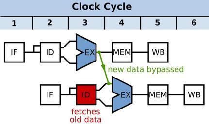 | Keywords: Data Forwarding (One Stage).svg en Diagram showing data forwarding in a microprocessor In this case the instructions are something like the following <br> SUB r3 r4 -> r10<br> AND r10 3 -> r11 Thus the data can be forwarded from the output of the first instructions' EX stage to the input of the next's green line This is forward in time Own Inductiveload 2009-01-23 Pipeline diagrams computer science SVG flow charts | ||||