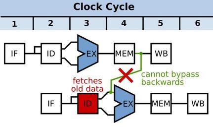 | Keywords: Data Forwarding (Two Stage, error).svg en Diagram showing data forwarding in a microprocessor In this case the instructions are something like the following <br> LDB adr -> r10<br> AND r10 3 -> r11 Thus the data can be forwarded from the output of the first instructions' MEM stage to the input of the next's EX stage green line However the dat doesn't arrive at the output of the first's MEM until after the first reaches EX This is backward in time and is not possible Own Inductiveload 2009-01-23 Pipeline diagrams computer science SVG flow charts |