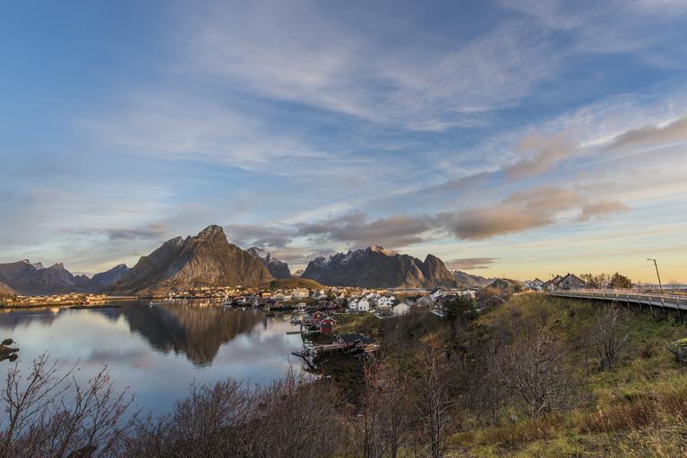 Keywords: dawn lofoten boats cabins sky refuge valley blue nature norway
