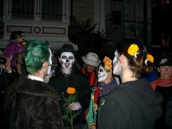 | Keywords: Day of the Dead (Dia de los Muertos) procession in San Francisco, 2006 2.JPG Day of the Dead or in Spanish Dia de los Muertos procession and altars in the Mission District San Francisco California It is annually celebrated in San Franciso since 1988 Many participants come in costumes where dark or black and white colors are prevalent with faces painted to emulate skulls or with skull masks The procession goes through several streets in the Mission District ending at the Gardfield park where altars are set up The organizers http //www dayofthedeadsf org/ explain the tradition in the following way Dia de los Muertos is a traditional Meso-American holiday dedicated to the ancestors; it honors both death and the cycle of life In Mexico neighbors gather in local cemeteries to share food music and fun with their extended community both living and departed The celebration acknowledges that we still have a relationship with our ancestors and loved ones that have passed away In San Francisco Day of the Dead has been celebrated in the Mission district since the early 70s with art music performances and a walking procession which help us contemplate our existence and mortality -- a moment to remember deceased friends and family and our connections beyond our immediate concerns For the 2013 procession the organizers described the event as follows Over 15 000 people will gather in the Mission to participate in the 26th Annual Dia de los Muertos or Day of the Dead Procession Altars Through art music and ritual this event honors our ancestors and celebrates the vitality and richness of today's community While the ceremony remains true to its Latino roots the San Francisco procession actively encourages participation by people of all origins Bring candles photos food or something that reminds you of a person that has passed away The altars are community art installations that are intended to change as each person adds something to the hearth 2006-11-02 own Al83tito cc-zero Uploaded with UploadWizard Day of the Dead in San Francisco 2006 in San Francisco |