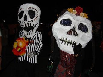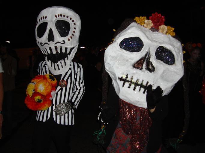 | Keywords: Day of the Dead (Dia de los Muertos) procession in San Francisco, two people with paper mache skull masks, 2009.JPG Day of the Dead or in Spanish Dia de los Muertos procession and altars in the Mission District San Francisco California It is annually celebrated in San Franciso since 1988 Many participants come in costumes where dark or black and white colors are prevalent with faces painted to emulate skulls or with skull masks The procession goes through several streets in the Mission District ending at the Gardfield park where altars are set up The organizers http //www dayofthedeadsf org/ explain the tradition in the following way Dia de los Muertos is a traditional Meso-American holiday dedicated to the ancestors; it honors both death and the cycle of life In Mexico neighbors gather in local cemeteries to share food music and fun with their extended community both living and departed The celebration acknowledges that we still have a relationship with our ancestors and loved ones that have passed away In San Francisco Day of the Dead has been celebrated in the Mission district since the early 70s with art music performances and a walking procession which help us contemplate our existence and mortality -- a moment to remember deceased friends and family and our connections beyond our immediate concerns For the 2013 procession the organizers described the event as follows Over 15 000 people will gather in the Mission to participate in the 26th Annual Dia de los Muertos or Day of the Dead Procession Altars Through art music and ritual this event honors our ancestors and celebrates the vitality and richness of today's community While the ceremony remains true to its Latino roots the San Francisco procession actively encourages participation by people of all origins Bring candles photos food or something that reminds you of a person that has passed away The altars are community art installations that are intended to change as each person adds something to the hearth 2009-11-02 own Al83tito cc-zero Uploaded with UploadWizard Day of the Dead in San Francisco |