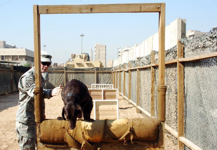 Keywords: Day in the life of a military working dog handler DVIDS128248.jpg en Spc Jacob Evans a military working dog handler and combat engineer from Dover Tenn commands his dog Muddy to jump over an obstacle during search training Nov 12 2008 Evans is assigned to 67th Engineer Canine Detachment at Fort Leonard Wood Mo and Muddy is German Shorthair Pointer trained for explosives detection 2008-11-12 Sgt 1st Class Matthew Meadows https //www dvidshub net/image/128248 128248 2008-11-12 16 41 FORWARD OPERATING BASE LOYALTY IQ PD-USGov Fort Leonard Wood Images from DoD uploaded by Fæ |