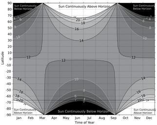 | Keywords: DayLength.svg Length of day sunrise to sunset in hours as a function of latitude and time of year Sunrise and sunset times were calculated using the FORTRAN program sunae f found at ftp //climate1 gsfc nasa gov/wiscombe/Solar_Rad/SunAngles/sunae f Atmospheric refraction appropriate for the US Standard Atmosphere is applied at all latitudes though the correction should vary by latitude and time of year Contours are not necessarily smooth because of the 0 5-degree latitude spacing used in the calculations Calculations were performed for the 365 days in 2007 on the Greenwich Meridian For each minute during 2007 the sun's elevation the angle between a flat horizon and the apparent location of the center of the sun accounting for refraction was calculated at -90 -89 5 -89 89 5 and 90° latitude and 0° longitude The sunrise time was found by linearly interpolating to the time when the solar elevation was 0° going from negative to positive; the sunset time was found the same way but for the elevation going from positive to negative This ignores the fact that the diameter of the sun is about 0 5° meaning the top of the sun does not drop below the horizon until the solar elevation is -0 25° Ignoring the diameter of the sun slightly shortens the calculated length of the day but the difference is not significant when plotted on this scale Own 2007-09-05 StephenHudson PNG version that loads much more easily on my browsers is available Image DayLength png Day length |