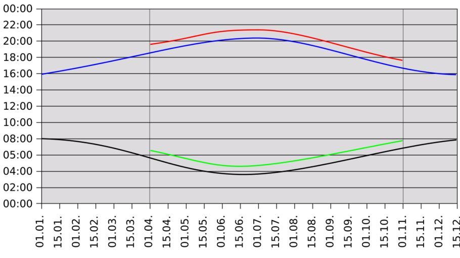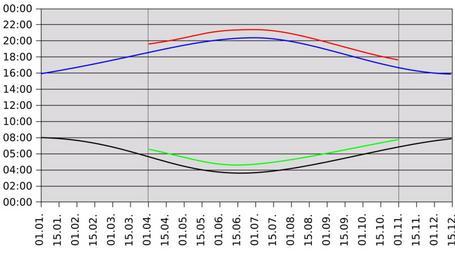 | Keywords: Daylight Saving Time.svg Daylight Saving Time Sommerzeit Sonnenaufgangs- und Untergangszeiten bei Normalzeit und Sommerzeit; The chart plots the clock times with DST adjustment as separate lines of sunrise and sunset in Greenwich England for 2007 Own 2008-04 Werneuchen Daylight saving time |