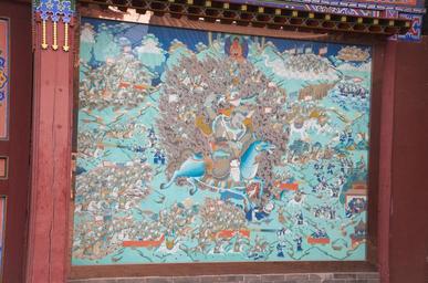 | Keywords: Dazhao.peinture de guerre.2.jpg Temple Dazhao de Hohhot en Mongolie-Intérieure On y voit Siddhartha Gautama en haut au centre et une scène de bataille ou une grande déité bouddhiste guerrière à cheval pourrait aussi être Daychin tengry est entourée de combattants à dos de chevaux et éléphants blancs et d'autres dans des chariots munis de lances de fusils et de bannières comportant un croissant combattant contre des ennemis utilisant lances et canons Hohhot in Inner Mongolia We can see at uppercenter Siddhartha Gautama This is a battle scene with a big bouddhist war deiti mounting horse in the middle surrounded by warriors on horse white elephants and horsecar with in their hands lances and guns and banner with moon crescent zh 大招寺画㠂 2015-05-06 14 02 04 Dazhao Tmeple Hohhot author other versions PD-Art Dazhao Temple in Hohhot Thangka from China Thangka from Mongolia Paintings of Gautama Buddha |