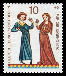 | Keywords: DBPB 1970 354 Minnesänger.jpg Berlin series for social welfare for the youth 1970 Minnesingers Jugendmarken Berlin 1970 Minnesänger Graphics by Froitzheim Ausgabepreis 10+5 Pfennig First Day of Issue / Erstausgabetag 5 Februar 1968 Michel-Katalog-Nr 354 Berlin scanned by NobbiP 2009-01 scanned by NobbiP PD-old-100 <gallery> File DBPB 1970 355 Minnesänger jpg File DBPB 1970 356 Minnesänger jpg File DBPB 1970 357 Minnesänger jpg </gallery> Philately Heinrich von Stretlingen Miniatur aus der großen Heidelberger Liederhandschrift Nennwert 10+5 Pfennig 1970-02-05 Froitzheim 3 038 000 Rastertiefdruck 354 Berlin Jugendmarken Codex Manesse 070v Couples on stamps 1970 Deutsche Bundespost Berlin stamps 354 Minnesingers |