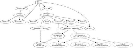 | Keywords: DC++ derivatives.svg en Graph showing DC++ derivates tree http //www adcportal com/wiki/Client_Software ADC developers wiki validSVG http //tehnick-8 narod ru/dc_clients/ Tehnick 2011-08-24 CC-Zero Created with Graphviz Graphviz Source <source lang dot >digraph G SparkDC++\nNon-GPL-compliant color grey; GreylinkDC++\nNon-GPL-compliant color grey; PeLink\nNon-GPL-compliant color grey; RayLinkDC++\nNon-GPL-compliant color grey; AvaLink\nNon-GPL-compliant color grey; DC++ -> LinuxDC++ ; DC++ -> EiskaltDC++ ; DC++ -> StrongDC++ ; DC++ -> DiCe ++ ; DC++ -> BCDC++ ; BCDC++ -> StrongDC++ style dashed ; LinuxDC++ -> FreeDC++ ; FreeDC++ -> BMDC++ ; FreeDC++ -> EiskaltDC++ style dashed ; StrongDC++ -> zK++ ; StrongDC++ -> TkDC++ ; StrongDC++ -> RSX++ ; StrongDC++ -> AirDC++ ; StrongDC++ -> StrongDC++ SQLite ; StrongDC++ -> ApexDC++ ; StrongDC++ SQLite -> FlylinkDC++\nver > 5xx style dashed ; ApexDC++ -> ApexDC++ Speed-Mod ; ApexDC++ -> FlylinkDC++\nver < 4xx style dashed ; ApexDC++ -> DiCe ++ style dashed ; ApexDC++ Speed-Mod -> GreylinkDC++\nNon-GPL-compliant ; ApexDC++ Speed-Mod -> FlylinkDC++\nver < 4xx ; GreylinkDC++\nNon-GPL-compliant -> PeLink\nNon-GPL-compliant ; GreylinkDC++\nNon-GPL-compliant -> SparkDC++\nNon-GPL-compliant ; GreylinkDC++\nNon-GPL-compliant -> RayLinkDC++\nNon-GPL-compliant ; GreylinkDC++\nNon-GPL-compliant -> AvaLink\nNon-GPL-compliant style dashed ; FlylinkDC++\nver < 4xx -> FlylinkDC++\nver > 5xx ; FlylinkDC++\nver < 4xx -> AvaLink\nNon-GPL-compliant ; </source> SVG diagrams in English DC++ Images with Graphviz source code |