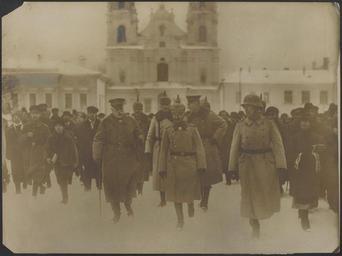 | Keywords: De Duitsche troepen bij den opmarsch in het bezette Minsk..jpg nl De Duitsche troepen bij den opmarsch in het bezette Minsk Generaal-veldmaarschalk von Eichhorn links en generaal von Bredow rechts met officieren van den staf bezichtigen de pas ingenomen stad be ямецкія войскі на ма шы ў акупаваным інску Гене ал-фельдма шал фон Эйнха н злева і гене ал фон Б эдаў сп ава з суп ацоўнікамі пе саналу наведалі нядаўна заняты го ад 1918 http //afbeeldingen gahetna nl/naa/thumb/1280x1280/536e321b-d957-4407-96f2-162a6dd3d2a9 jpg onbekend Custom license marker 2013 02 05 PD-old Uploaded with UploadWizard 1914 in Minsk Hermann von Eichhorn Freedom square Minsk History of the Archcathedral of Name of the Blessed Virgin Mary in Minsk Jesuit College in Minsk |