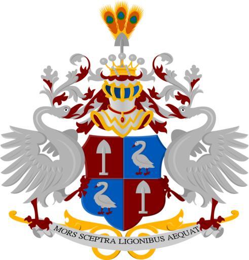 | Keywords: De Graeff wapen.svg coat of arms of de Graeff 1885 verheffing Koninklijk Besluit 10 maart 1885 Dirk de Graeff diploma op 29 april 1885 Wapen Gevierendeeld; I en IV in rood een zilveren schop het blad omhoog; II en III in blauw een zilveren zwaan rood gebekt en gepoot Een aanziende helm blauw gevoerd; een kroon van vijf parels; dekkleden rood en zilver; helmteken de schop van het eerste kwartier uitkomend waarachter drie pauwenveren van natuurlijke kleur; schildhouders twee zwaenen als van het tweede kwartier maar met geopende naar boven gerichte vlucht en met de binnenste poot het schild houudende; het geheel geplaatst op een gouden arebesk; wapenspreuk MORS SCEPTRA LIGONIBUS AEQUAT 'De dood maakt scepters en houwelen gelijk' in zwarte letters op een wit lint Wapenregister van de Nederlandse adel Hoge Raad van Adel 1814 - 2014 Auteur Coen O A Schimmelpenninck van der Oije Egbert Wolleswinkel Jos van den Borne Conrad Gietman Uitgave WBooks 2014 bladzijde 301 SVG own 2014 Arch Coats of arms of families of the Netherlands Coats of arms of De Graeff family Swans in heraldry De Graeff family Coat of Arms by Arch Swans in supporters Heraldic lambrequins argent and gules |