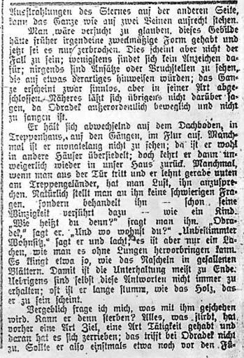 | Keywords: De Kafka Die Sorge des Hausvaters 5b.jpg De_Kafka_Die_Sorge_des_Hausvaters_ jpg 5a 6 Book Creator Franz Kafka Die Sorge des Hausvaters In Selbstwehr Unabhängige jüdische Wochenschrift Series title Siegmund Kaznelson 1919-12-19 Prag http //www textkritik de/kafkazs/kafkadrucke htm Textkritik PD-old Other versions 5a 5b 6 De Kafka Erstdrucke in Zeitschriften |