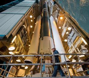 Keywords: worker preparing launch gantry United Launch Alliance Delta rocket Soil Moisture Active Passive (SMAP) observatory