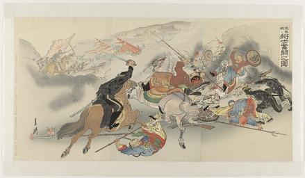 | Keywords: De moeizame strijd bij Feng Huang Cheng-Rijksmuseum RP-P-2010-310-59.jpeg accession number RP-P-2010-310-59 Ogata GekkôOgata Gekkô died 1920; Matsuno Yonejirô credit line nl In een rokerig gevecht verslaan Japanse soldaten de Chinezen De echte slag was feitelijk ten noorden van de stad Feng Huang Cheng De Japanners waren van plan de stad over te nemen maar op 29 oktober 1894 verlieten de inwoners de stad en staken haar in brand De campagne in Mantsjoerije vond plaats in de maand oktober tijdens de Eerste Chinees-Japanse Oorlog 1894-1895 Label Line mentioned on object Ogata Gekkô 1859 - 1920 1894 kleurenhoutsnede; blinddruk; lijnblok in zwart met kleurblokken; polijsten Collection prenten; Japan collectie blad Height mm 371 Width mm 723 exhibition history paper object history Acquisition 2009-10-13 object type prent PD-US PD-old Data and photography rights All data and all images made available through the API are either in the public domain or are subject to a CC0 license https //www rijksmuseum nl/en/api/terms-and-conditions-of-use cc-zero place of creation Japan http //www rijksmuseum nl/collectie/RP-P-2010-310-59 http //hdl handle net/10934/RM0001 COLLECT 489990 handle De moeizame strijd bij Feng Huang Cheng Uploaded with GWToolset Rijksmuseum RP-P-2010-310-59 http //www rijksmuseum nl/media/assets/RP-P-2010-310-59 Images uploaded by Fæ Images from the Rijksmuseum Japanese 19th-century prints in the Rijksmuseum Amsterdam |