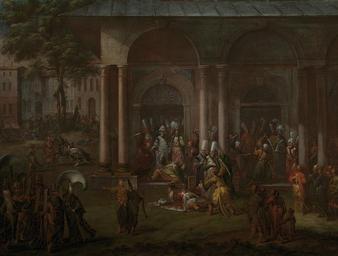 | Keywords: De moord op Patrona Halil en zijn volgelingen Rijksmuseum SK-A-2012.jpeg accession number SK-A-2012 Jean Baptiste Vanmour credit line nl De moordaanslag op de leider van de opstandelingen Patrona Halil 1730 De extravagante feesten van de ˜Tulpensultan ™ zorgden voor veel onrust onder de bevolking Op 28 september 1730 brak een opstand uit onder leiding van Patrona Halil een Albanese zeeman De rebellen slaagden de rebellen erin de sultan af te zetten en installeerden zijn neef Mahmud I Nadat Mahmud I de troon had bestegen bleven de rebellen voor onrust zorgen Zij probeerden posities in de regering te bemachtigen en eisten steeds meer invloed Mahmud nodigde hen met een smoes uit op het paleis waar zij één voor één werden omgebracht Rechts wordt Patrona Halil overmeesterd terwijl links de dienaar die op zijn paard paste al is vermoord In het midden ziet men de groot-vizier Damad Ibrahim pasja uit zijn paleis komen vergezeld door een van de opperrechters en een van de thesauriers Uit de andere deur komen de admiraal en de andere opperrechter naar buiten terwijl links een officier van de wacht bevelen geeft aan een groep janitsaren in krijgstenue Op de achtergrond kan men nog zien hoe de dienaren van de groot-vizier worden afgeslacht Hiermee kwam de opstand definitief tot een eind Collection schilderijen; Vanmour serie ; Jean Baptiste Vanmour 1671-1737 olieverf op doek ca 1730-1737 drager Height cm 75 drager Width cm 101 exhibition history 2003-2004 An eyewitness of the Tulip Era Jean-Baptiste Vanmour Istanbul 2003-2003 De Ambassadeur de Sultan and de Kunstenaar op audiëntie in Istanbul Amsterdam Institution Rijksmuseum Technique oil canvas object history Acquisition 1902 object type Potential derivatives exist check http //commons wikimedia org/w/index php search Rijksmuseum+SK-A-2012 this search PD-US PD-old Data and photography rights All data and all images made available through the API are either in the public domain or are subject to a CC0 license https //www rijksmuseum nl/en/api/terms-and-conditions-of-use cc-zero place of creation http //www rijksmuseum nl/collectie/SK-A-2012 De moord op Patrona Halil en zijn volgelingen Q17326812 Uploaded with GWToolset De moord op Patrona Halil en zijn volgelingen Rijksmuseum SK-A-2012 http //www rijksmuseum nl/media/assets/SK-A-2012 Images uploaded by Fæ Images from the Rijksmuseum Turkish paintings in the Rijksmuseum Amsterdam Paintings by Jean Baptiste Vanmour |
