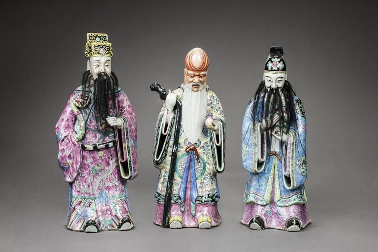Keywords: De tre taoistiska stjärngudarna. Lu Xing, Shou Xing och Fu Xing - Hallwylska museet - 107683.tif LSH artwork sv FIGUR Fu Xing en av de tre taoistiska stjärngudarna för lycka hög rang och långt liv Stående hållande ett gossebarn intill bröstet Mustascher och skägg av svart tagel <br/>De tre taoistiska stjärngudarna kopplades av astrologer ihop med planeter och stjärnor på himlen De var populära i både tempel och hem och kan än i dag ses i kinesiska butiker och restauranger Figuren i mitten är Shou Xing <br/>guden för ett långt liv och han har ett förstorat kranium vilket är tecken på visdom Han är en gammal man och håller en käpp i ena handen och en av odödlighetens persikor i den andra Lu Xing guden för hög rang håller en<br/>ruyispira för önskeuppfyllelse i en hand och han bär ämbetsmannens hatt och rock Fu Xing lyckans gud bär en liten pojke i sina händer Fu Xing och Lu Xing har båda riktigt hår instucket i hålen i sina ansikten vilket ska föreställa frodiga skägg mustascher och polisonger Trion köptes på Bukowskis 1910 och delarna tillverkades troligen inte långt dessförinnan <br/>Inköpta hos Bukowskis konsthandel 1910 tillsammans med XI C h b 28 och 29 för 4 500 Kr <br/>Figure The Three Star Gods of Longevity High Rank and Happiness porcelain decorated in overglaze enamels<br/>Qing dynasty c 1900<br/>The Three Daoist Star Gods were deities linked by astrologers to planets and stars in the sky Popular in temples and households they may still be seen in Chinese shops and restaurants today The central figure of Shou Xing deity of long life has an enlarged cranium denoting wisdom An old man he holds a staff in one hand the one of the Peaches of Immortality in the other Lu Xing deity of High Rank holds a ruyi wish-fulfilling sceptre in one hand and wears the cap and robes of an official Fu Xing deity of Happiness carries a small boy in his hands Fu Xing and Lu Xing both have real hair inserted into holes in their faces to form luxuriant beards moustaches and whiskers The triad were bought at Bukowskis in 1910 and the pieces were probably made not long before that date original caption De tre taoistiska stjärngudarna Lu Xing Shou Xing och Fu Xing <br/> Nyckelord Figurer Astrologi Föremålsbild Porslinsfigurer Gud Religioner Mytologi 1900 size cm 52 5 HWY place of origin CN original filename hm_dig16531 14859 inventory number HWY XLVIII XI C h b 30 107683 CC-BY-SA Jens Mohr <gallery caption Different images of same object > File Kinesisk figur föreställande Fu xing en av de tre taoistiska stjärngudarna för lycka - Hallwylska museet - 95995 tif File Kinesisk figur bakifrån föreställande Fu xing taoistiska stjärnguden för lycka från 1800-talet - Hallwylska museet - 95996 tif </gallery> Fu Lu Shou Figurines Porcelain sculptures History of astrology Ceramics of China Jens Mohr Media contributed by LSH unmatched keyword Media contributed by LSH 2016-05 |