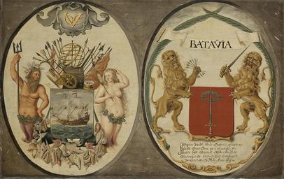 | Keywords: De wapens van de VOC en Batavia Rijksmuseum SK-A-4643.jpeg nl De wapens van de Verenigde Oost-Indische Compagnie en van de stad Batavia Het wapen van de VOC toont een zeilend schip op zee; links van het wapen staat Neptunus rechts Amphitrite of een zeemeermin met een spiegel Onderaan een festoen van schelpen bovenaan wapens vaandels nautische instrumenten en attributen van de zeevaart Het wapen van Batavia toont een zwaard bekroond met een lauwerkrans aan weerszijden leeuwen bewapend met de zeven pijlen en een zwaard het geheel omsloten door twee gekruiste palmtakken Het opschrift memoreert de verovering van de stad Jacatra op de Engelsen en Bantammers op 30 mei 1619 Onderdeel van de collectie heraldische objecten ; Jeronimus Becx werkzaam ca 1649 “1658 olieverf op paneel 1651 drager Height cm 63 drager Width cm 97 exhibition history Institution Rijksmuseum object history Acquisition 1874 object type heraldisch object PD-US PD-old-100 Data and photography rights All data and all images made available through the API are either in the public domain or are subject to a CC0 license https //www rijksmuseum nl/en/api/terms-and-conditions-of-use cc-zero place of creation http //www rijksmuseum nl/collectie/SK-A-4643 De wapens van de VOC en Batavia Q17340464 Uploaded with GWToolset De wapens van de VOC en Batavia Rijksmuseum SK-A-4643 http //www rijksmuseum nl/media/assets/SK-A-4643 Images uploaded by Fæ Images from the Rijksmuseum Dutch Golden Age paintings in the Rijksmuseum Amsterdam Jeronimus Becx II |