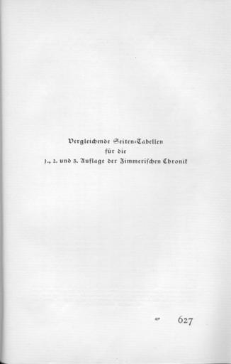 | Keywords: De Zimmerische Chronik S 627.jpg Vergleichende Seiten Tabellen für die 1 2 und 3 Auflage der Zimmerischen Chronik Seite 627 Zimmerische Chronik urkundlich berichtet von Graf Froben Christof von Zimmern 1567 und seinem Schreiber Johannes Müller 1600 Nach der von Karl Barack besorgten zweiten Ausgabe neu herausgegeben von D Paul Hermann F W Hendel Verlag in Meersburg am Bodensee und Leipzig Vierter Band 1932 Bearbeitet von Paul Hermann PD-old Zimmerische Chronik Dritte Auflage | ||||