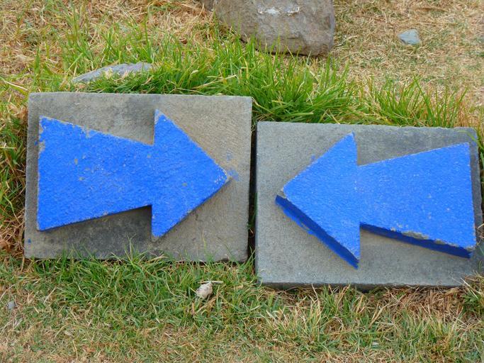 Keywords: dead end blind alley stop arrows blue opposites contrast contradictory counter collision each other to each other attract signposts misleading case