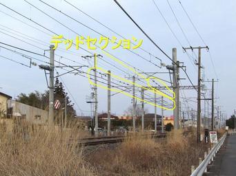 | Keywords: Dead-section(fujishiro-toride)2.JPG The AC/DC section on Joban Line between Toride and Fujishiro Stations 常磐線取手駅 - 藤代駅間のデッドセクション(手前が直流 1 500 V 区間 奥が交流 20 kV 50 Hz 区間) Own toshinori baba 2010-02-21 Overhead lines in Japan Jōban Line Toride Ibaraki Overhead line section insulators |
