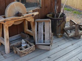 Keywords: deadman ranch ancient buildings wooden western style wild west ghost town heritage old building heritage site vintage antique british columbia canada tourist attraction countryside outdoor metal rusty rust metal rusty farm equipment tools sharpening stone