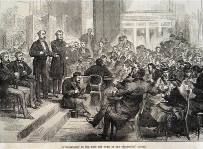 Keywords: Deaf and Dumb event at Freemason's Tavern.jpg Freemason's Tavern London with sign language for deaf and dumb people published in the Illustrated London News The hall was designed by en Thomas Sandby 1875-01-23 Illustrated London News anonymous other versions PD-old-70-1923 London in the 1870s Sign language Freemasons' Tavern Thomas Sandby |