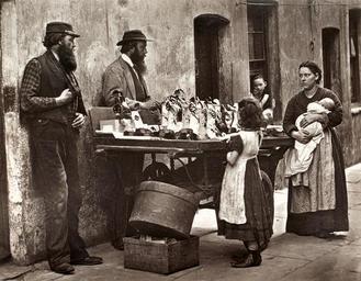 | Keywords: street_life_in_london streetlifeinlondon street sellers streetsellers monochrome musician people performer From 'Street Life in London', 1877, by John Thomson and Adolphe Smith: 'The accompanying photograph represents a street group gathered round a dealer whose barrow is one of the most attractive I have seen during my wanderings about town. The story of its owner was narrated to me in the following words :- [...] “There are now too many 'swags' and most of them ain't the gentlemen they used to be. I should say there are 1500 ‘swag' dealers about London, counting women, boys, and girls. The average clear profits all round would, I think, be about fourteen shillings each a week. My missus and myself between us, we make clear over thirty shillings a week. It takes about thirty shillings to keep us, five shillings a week rent, and the rest for clothes, food, and fuel. Three or four years ago I have drawn as much as two pounds on a Saturday night. Out of that I had about twenty-six shillings profit. Now I have not been drawing more than five shillings a day, except on rare occasions. The profits are much lower at present. Ten shillings out of the sovereign is considered good now. The profit is not so great as it looks, when you think of how long we stand and how many are the folks we supply before we get a pound. It must take about fifty customers to make up a pound of money. Times are bad, and I have left the streets for a regular job. My wife minds the barrow. But bad as times be, it's wonderful how women will have ornaments. I have had them come with their youngsters without shoes or stockings, and spend money on ear-drops, or a fancy comb for the hair.”' For the full story, and other photographs and commentaries, follow this link and click through to the PDF file at the bottom of the description archives.lse.ac.uk/Record.aspx?src=CalmView.Catalog&i... From 'Street Life in London', 1877, by John Thomson and Adolphe Smith: 'The accompanying photograph represents a street group gathered round a dealer whose barrow is one of the most attractive I have seen during my wanderings about town. The story of its owner was narrated to me in the following words :- [...] “There are now too many 'swags' and most of them ain't the gentlemen they used to be. I should say there are 1500 ‘swag' dealers about London, counting women, boys, and girls. The average clear profits all round would, I think, be about fourteen shillings each a week. My missus and myself between us, we make clear over thirty shillings a week. It takes about thirty shillings to keep us, five shillings a week rent, and the rest for clothes, food, and fuel. Three or four years ago I have drawn as much as two pounds on a Saturday night. Out of that I had about twenty-six shillings profit. Now I have not been drawing more than five shillings a day, except on rare occasions. The profits are much lower at present. Ten shillings out of the sovereign is considered good now. The profit is not so great as it looks, when you think of how long we stand and how many are the folks we supply before we get a pound. It must take about fifty customers to make up a pound of money. Times are bad, and I have left the streets for a regular job. My wife minds the barrow. But bad as times be, it's wonderful how women will have ornaments. I have had them come with their youngsters without shoes or stockings, and spend money on ear-drops, or a fancy comb for the hair.”' For the full story, and other photographs and commentaries, follow this link and click through to the PDF file at the bottom of the description archives.lse.ac.uk/Record.aspx?src=CalmView.Catalog&i... |
