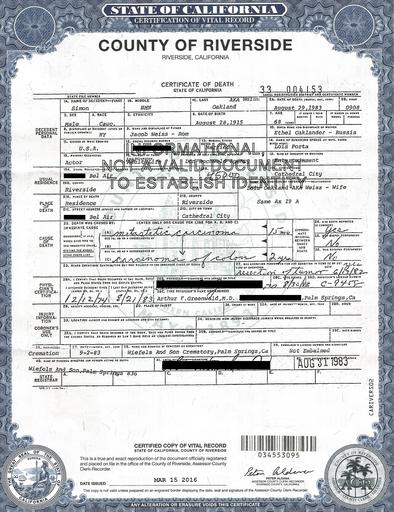 | Keywords: Death Certificate of Simon Oakland.jpg en Death certificate of U S actor Simon Oakland 1915-1983 1983-08-31 County of Riverside California Assessor-County Clerk-Recorder other versions Custom license marker 2016 03 30 PD-CAGov Death certificates |