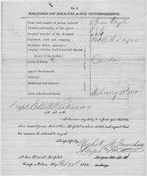 | Keywords: Death and Interment Record for Green Doyle - NARA - 279479.tif Scope and content Rank Private Regiment 6 Branch United States Colored Troops Regulars Unit G Full Unit Designation G 6th United States Colored Troops Regulars Death Date 02/23/1865 Grave Number 0985 General notes Note that only a portion of this document has been digitized and made available online 279479 Local identifier War Department Military Division of the Tennessee Department of Tennessee Post of Chattanooga Tennessee Quartermaster 1865 - 1866 NARA's Southeast Region Atlanta NRCA 5780 Jonesboro Road Morrow GA 30260 Record group Record Group 92 Records of the Office of the Quartermaster General 1774 - 1985 Record group ARC 421 Records of Death and Interment at Camp Nelson KY compiled 1864 - 1865 Series ARC 279423 File unit File unit ARC Variant control numbers NAIL Control Number NRCA-92-QMG003-61 yes Other versions NARA-cooperation PD-USGov Documents in English |