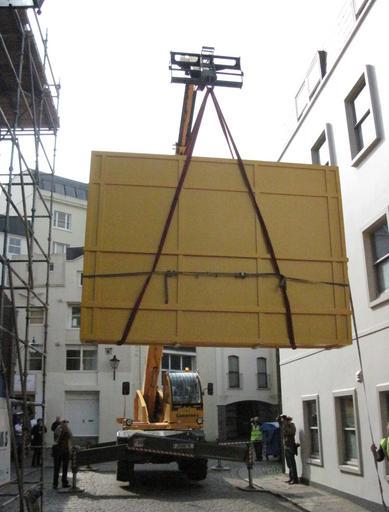| Keywords: Death of Major Peirson Jersey Museum 2012 4.jpg John Singleton Copley's painting The Death of Major Peirson arrived in Jersey for exhibition for the first time in 2012 on loan from the Tate It was hoisted into the Jersey Museum on 3 April 2012 A window and part of a wall had to be removed to enable access to the gallery for the crated painting own photo 2012-04-03 09 46 54 Man vyi The Death of Major Peirson 2012 in Saint Helier Jersey Exhibitions in 2012 Crates Lifting Jersey Museum and Art Gallery Scaffolding in Jersey |