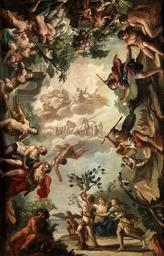 | Keywords: Deckengemälde Bozzetto 18Jh Jagd.jpg Bozzetto zu einem Deckengemälde wohl eines Jagdschlosses <br> Motive Zeus mit dem Adler und Juno mit dem Pfau darunter der Sonnenwagen des Musengottes Apoll; Apollo und Daphne mythologische Jagd; Steinsockel mit Blumenvase und Amoretten die die Jagdhunde der Diana anbinden; Diana im Bade; Diana von Aktaion belauscht; ein Flussgott oil on canvas 75 x 47 cm http //hampel-auctions com/ Hampel Auctions ~ 1740 follows shortly PD-old-100 Baroque paintings Hunting in art Paintings of Apollo and Diana Paintings of Diana and Actaeon Daphne mythology 1740s mythological paintings 18th-century paintings location missing 1740s oil on canvas paintings 18th-century paintings not categorised by year Diana after antiquity Paintings of hunting Diana Images from Hampel Auctions |