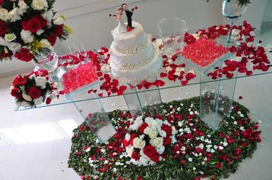 Keywords: decorated table wedding cake wedding decoration flowers petals dessert