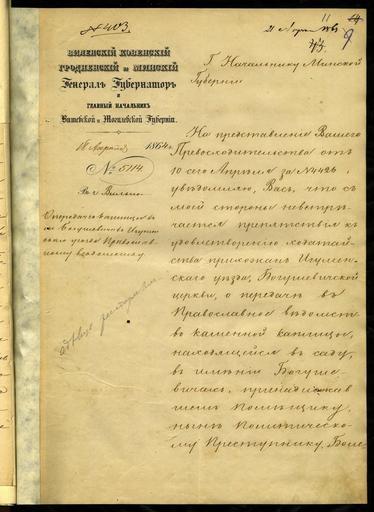 | Keywords: Decree of the Vilno General-Governor Mikhail Nikolayevich Muravyov to Minsk Governor - 18 April 1864 AD - a.jpg en Decree of the Vilno General-Governor Mikhail Nikolayevich Muravyov to Minsk Governor first page Signed April 18 1864 AD in Vilno city Russian empire ru Распо яжение виленского гене ал-губе нато а ихаила иколаевича у авьева минскому г ажданскому губе нато у о пе еделке из католической в п авославную каменной часовни в де евне Богушевичи Игуменского уезда п инадлежавшей команди у повстанческого от яда -- помещику Болеславу Свенто жецкому пе вая ст аница Издан в г Вильнюс Российская Импе ия 18 ап еля 1864 г be Распа аджэнне віленскага гене ал-губе ната а іхаіла ікалаевіча у аўёва мінскаму г амадзянскаму губе ната у аб пе а абленні з каталіцкай у п аваслаўную каменнай капліцы ў вёсцы Багушэвічы Ігуменскага павета якая належала камандзі у паўстанцкага ат ада -- маянткоўцу Баляславу Свента жэцкаму пе шая ста онка Выдадзены ў г Вільня Расійская Імпе ыя 18 к асавіка 1864 г National historical archive of Belarus Minsk Belarus the Vilno General-governorship office 1864 Баляслаў Свента жэцкі маёнтак Багушэвічы Ігуменскі павет Mikhail Nikolayevich Muravyov Northwestern Krai January Uprising documents PD-old |