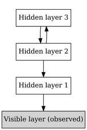 | Keywords: Deep belief net.svg deep belief net own Qwertyus 2013-12-25 Created using en Graphviz source <source lang dot > digraph rankdir TB node shape rectangle ; / top two layers form an undirected graphical model / subgraph cluster_top color white rankdir BT h3 label Hidden layer 3 h2 label Hidden layer 2 h3 -> h2 h2 -> h3 h1 label Hidden layer 1 v label Visible layer observed style filled h2 -> h1 h1 -> v </source> Neural networks Cc-zero | ||||