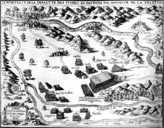 | Keywords: Defaitte des Suisses en Dauphiné.jpg Artwork LangSwitch map representing positions during a battle carte représentant un ordre de bataille Date 1899 11 30 Technique engraving black Musée de l'Ancien Évêché de Grenoble place of discovery object history exhibition history credit line full form Le portrait de la défaite des Suisses en Dauphiné par Monsieur de la Valette title recto top fr full form à Paris à Saint-Germain des prés rue de Seine à l'enseigne de la Croix blanche publisher's mark recto bottom left fr LangSwitch the map is taken from an old book la carte est extraite d ™un ouvrage ancien LangSwitch Cropped ™s versions Versions rognées sur Commons <gallery> File Defaitte des Suisses en Dauphiné det 1 jpg File Defaitte des Suisses en Dauphiné det 2 jpg </gallery> accession number place of creation own PD-old cite book Robert Aillaud Robert Aillaud chapter La bataille de Jarrie 19 août 1587 30 cm 978-2-9533-5080-7 Vasti-Dumas 2008 fr Battle of Jarrie Historical images of Isère Drac Romanche River Goncelin Pikemen Historical maps of Grenoble |