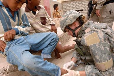 | Keywords: Defense.gov News Photo 060504-N-7034S-086.jpg en U S Army Pfc Corione Woods cleans an open wound on an Iraqi child's leg outside the Al-Nasar Welsalem police station in Baghdad Iraq on May 4 2006 Woods is treating the boy's leg during a joint neighborhood patrol with Iraqi army soldiers 060504-N-7034S-086 Navy http //www defense gov/photos/newsphoto aspx newsphotoid 7960 2006-05-04 en Petty Officer 1st Class Samuel W Shavers U S Navy PD-USGov-Military-Navy Defense gov news media for May 2006 Import by User Slick-o-bot/Defense gov News Photos Defense gov photos requiring renaming Taken with Nikon D2X United States Army |