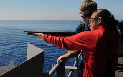 | Keywords: Defense.gov News Photo 090611-N-2344B-153.jpg en U S Navy Seaman Andrew Just supervises Petty Officer 3rd Class Ashley Tabotabo as she fires a 12-gauge shotgun during a live-fire exercise aboard the aircraft carrier USS Ronald Reagan CVN 76 in the Pacific Ocean on June 11 2009 The G-2 division of the Ronald Reagan's weapons department holds live-fire exercises regularly to give sailors the opportunity to qualify for the 12-gauge shotgun the 9 mm pistol and the M-16 rifle 090611-N-2344B-153 http //www defense gov/photos/newsphoto aspx newsphotoid 11384 2009-06-11 en Petty Officer 3rd Class Briana C Brotzman U S Navy PD-USGov-Military Import by User Slick-o-bot/Defense gov News Photos Taken with Nikon D300 Firearms training on USS Ronald Reagan CVN-76 |